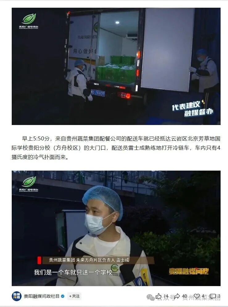 近日,贵阳融媒问政栏目对全市学生餐配送工作展开深度调研,聚焦学生餐安全配送问题报道了贵州蔬菜集团有限公司(以下简称蔬菜集团)的学生餐配送体系,介绍蔬菜集团的标准化操作流程和多层级监管机制,并对保障校园食品安全的工作成效给予多角度综合评价。